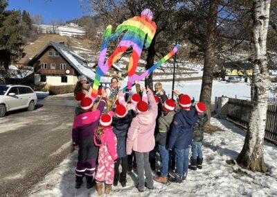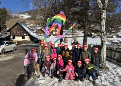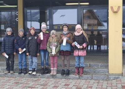 Am Faschingdienstag begrüßte uns Frau Bürgermeisterin Veronika Grill mit Beigerln, die uns die Gemeinde sponsert. Danach bekamen wir Überraschungsbesuch von Olivia, die im Rahmen des Jahresprojekts des AWV Liezen unsere gesammelten Batterien abholte. Anschließend konnte die Faschingsgaudi im Turnsaal starten. Am Ende kamen die Flinserl und zogen mit den Kinder jeweils nach Obersdorf und Kainisch weiter.